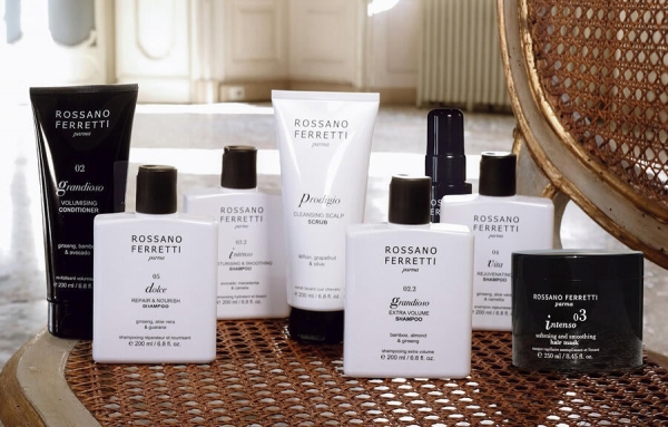 La philosophie Ferretti se prolonge dans une ligne de soins éponyme, Rossano Ferretti Parma, où la haute cosmétique capillaire utilise des ingrédients naturels pour nourrir et protéger le cheveu en profondeur.