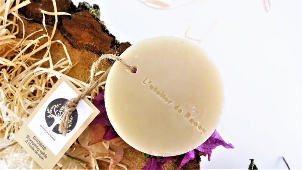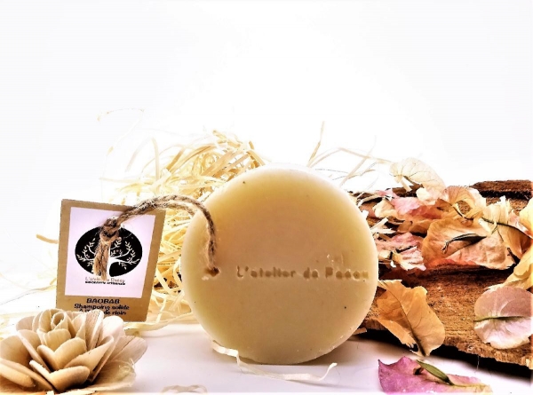 Le Shampoing Solide familial Baobab à base d'huile de ricin (35%), coco, beurre de karité, palme, rassal (propriétés similaires au rassoul). (L'huile de Palme utilisée ici est issue d'une culture durable garantie par Vigean sans déforestation et cultivée en zone rurale).