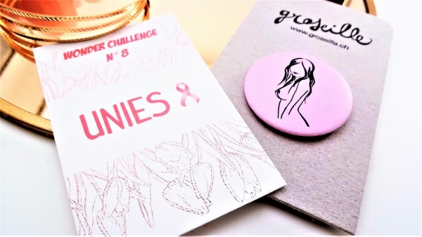 Enfin, pour terminer sur une touche symbolique, l'illustratrice suisse Magali alias Groseille prend le crayon pour immortaliser cette lutte contre le cancer du sein à travers ce magnifique badge plein de délicatesse et d'émotions spécialement conçu pour cette édition... Ce dernier d'ailleurs est directement lié au Wonder Challenge proposé par la box : soyons unies et solidaires, toutes ensemble, contre cette maladie, main dans la main. Le dépistage précoce est un grand avancement et peut sauver des femmes!