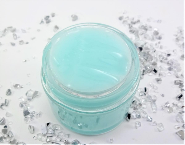 - Un pot en verre très chic laissant transparaître les microsphères bleues