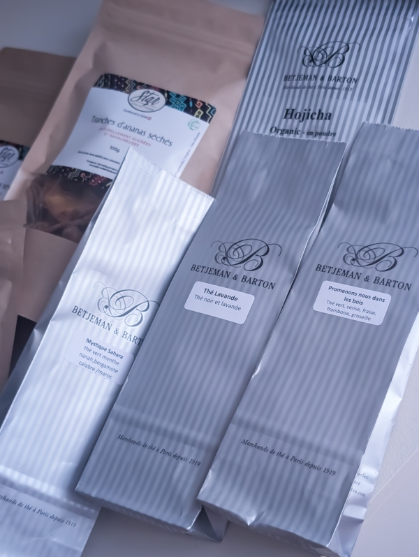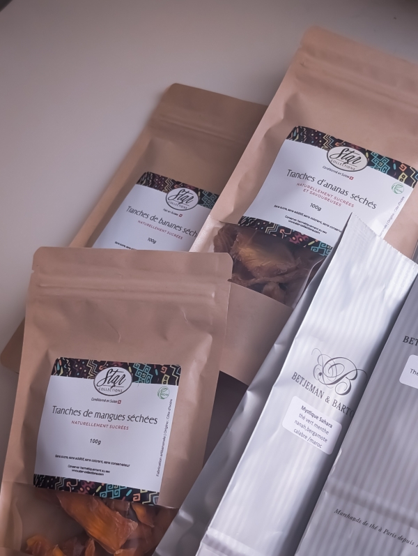 En parfaite harmonie avec ces thés, la boutique met en avant des gourmandises pour un "tea time" parfait ou un en-cas fruité: Les tranches de mangues, d'ananas et de bananes séchées, issues d'une sélection rigoureuse, complètent ces créations pour une pause pleine de saveurs et de naturel.