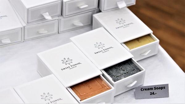 Plus haut de gamme, Swiss Toniq déploie un stand magnifique, luxueux où sensorialité et magie se rencontrent... Des confections raffinées et artistiques avec par exemple une boîte de truffes pour le bain et des coffrets de savons crémeux pour véritablement instaurer une touche d'élégance à notre rituel! J'ai été subjuguée par la subtilité du parfumage, du flaconnage des sérums, de l'ivresse olfactive jaillissant de chaque soin... À la lecture des intitulés, mon coeur battait la chamade... Et à l'ouverture de leur célèbre Advanced Repair Serum, une intense sensation de plénitude s'empara de moi: le Néroli enveloppe la précieuse galénique de ce prodige... J'ai été immédiatement transportée!