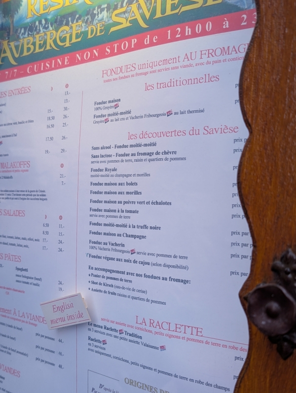 Au centre, une table dressée accueille un caquelon fumant et une fondue (au choix parmi la carte de l'Auberge de Savièse) onctueuse à souhait. Accompagné d’une bouteille de vin blanc local par exemple, vous voilà partis pour une balade d’une heure et demie.
