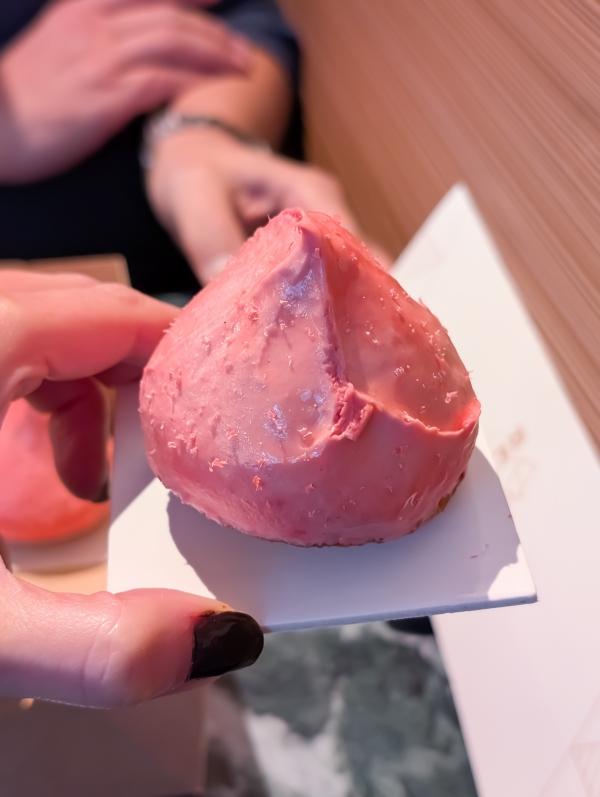 Cette douceur se compose d’un biscuit moelleux à l’amande, d’une compotée framboise-rose, d’un crémeux fondant, d’éclats de litchi et est sublimée par une crème légère à la rose. Sa forme et sa couleur rose vif en font un symbole poignant de l’initiative.