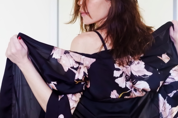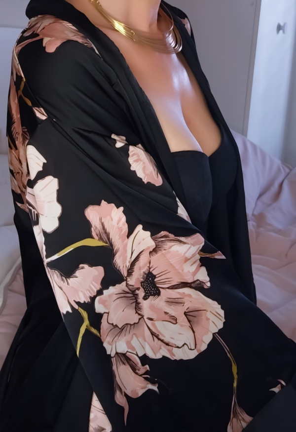 L'originalité de ce kimomo : les manches chauve-souris qui confèrent beaucoup de sensualité et son motif floral très élégant donnant ainsi douceur et grâce à cette pièce chic.